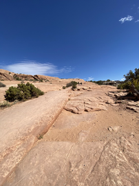 Woohoo! Parking was available and the trail was not as crowded as we feared...having a good portion of it to ourselves. The stars aligned to make this work as the weather was temperate ( high sixties) - we would NEVER recommend this trail in the afternoon during a hot summer day as the sun and wind are intense and there is NO shade to be had against the petrified sandstone and steep steps you will be traveling across. The trail is 3 miles round trip with an elevation gain of 480 feet. The trail was doable because we approached it slow and easy and took ample water breaks.